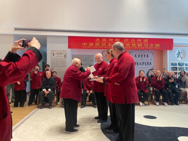 Dojechałem do końca… mistrz łaskawie kiwnął głową, jego żona również wyraziła aprobatę. Dostałem plakietkę, żółto-czerwony szalik (barwy pomylili! — przecież nie kibicuję Jagiellonii!), książkę z autografem mistrza oraz oczywiście przepięknie wykonaną umowę w czerwonych okładkach. Zapozowałem do kilku fotografii i w zasadzie było po wszystkim. Na koniec mistrz Zhai powiedział jeszcze kilka słów na temat łapania kontaktu z przeciwnikiem. Normalnie byłoby to dla mnie wydarzenie, ale naprawdę byłem już tym zmęczony, całe szczęście, że dostaliśmy jeszcze zapisane ręką mistrza wskazówki dotyczące tego tematu.