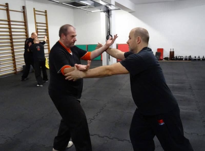 Drugim zaskoczeniem było: „omne liquens„. Czyli nie ma nic stałego, a forma to organizm żywy. Zauważyłem to już przy pierwszym ruchu. Broniący się wykonuje tam technikę „granie na harfie” – tak w każdym razie mnie uczono i tak jest to opisane w dostępnych mi książkach. Zawsze miałem z tym problem. Otóż atakujący uderza na splot słoneczny i zawsze się dziwiłem, dlaczego ja tę jego rękę podnoszę, czułem tu jakiś dysonans. Tym razem Bartek, kiedy zobaczył, co robię, powiedział: „Nie dźwigaj jego ręki, broń niżej”, ktoś inny dodał: „Złoty kogut”. Swoją drogą zawsze podobało mi się, że na pewnym etapie praktyki wystarczy rzucić człowiekowi dwa słowa, a on na tej podstawie diametralnie zmienia ćwiczenie. Nie chwaląc się, jak ktoś przećwiczył daną technikę x razy, to tyle mu wystarczy. W każdym razie kiedy zmieniłem technikę, wszystko się uprościło. Przestałem się siłować z ręką partnera.
