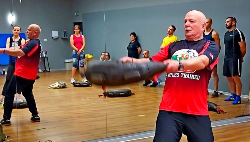 Sam trening? Jak zwykle nie będę opowiadał o szczegółach. Jak kto ma ochotę, to zapraszam do samodzielnego skosztowania tego chleba. Ogólnie, machałem skórzaną imitacją baranka o wadze 8 kg (to damski rozmiar, przyznam się ze wstydem), a cała sztuka, to umiejętność wykonania sześciu ćwiczeń, których naprawdę można się nauczyć na tym jednym spotkaniu. Ja następnego dnia prezentowałem wszystkie na treningu Tai Chi i dałem radę bez problemu. Trudność nie polega na opanowaniu ćwiczenia, ale na wykonaniu kilkuset (tak! kilkuset!) powtórzeń w ciągu 13 minut. Ten zestaw nosi nazwę „krwawego” protokołu (nosi też Inne, ale ten jest bardzo klikalny). Próbowaliśmy zrobić go na koniec treningu. Większości wyszło, ale byli tam ludzie, którzy już coś z workiem ćwiczyli, ja przyznam się, że zrobiłem jakieś 75%, co i tak uważam za sukces.