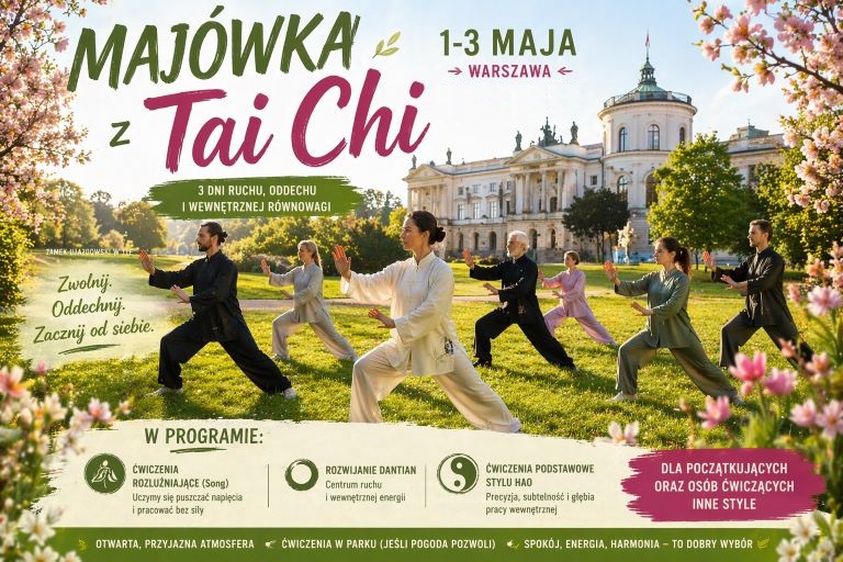 Masz ochotę zwolnić, odetchnąć i wejść w maj z większym spokojem? Zapraszam na trzydniowe spotkanie z Tai Chi – praktyką, która łączy ruch, świadomość i wewnętrzną równowagę. Warszawa jest fajnym miastem w majowe święta, cisza spokój i brak korków. Jeśli nie wyjeżdżasz to proponuję Ci udział w tej imprezie. Będziemy ćwiczyli w parku w centrum Warszawy (w tym czasie pustym i cichym) – w przypadku złej pogody przeniesiemy się na salę. W przerwach zajęć uczestnicy będą mieli możliwość degustacji dobrej herbaty. Każdy użytkownik otrzyma trzy miesięczny dostęp do materiałów video dotyczących poruszanych zagadnień.