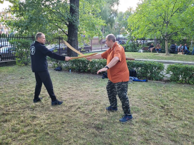 Na koniec, pokrótce. Co ćwiczyliśmy? Krótką formę z kijem (Tradycyjnie trzynastoruchową). Ale bardzo fajną i, jak to w formach z bronią w stylu Hao uczonych, można ją zapętlić i ćwiczyć sobie w kółko. Poza wspomnianym już potrząsaniem, poznaliśmy metodę ćwiczenia ocierania kija. Qrczę, wiem jak to brzmi, ale ćwiczenie od razu wpadło mi w oko. Tak bardzo, że próbowałem to samo zrobić z mieczem. Ciekawe czy z krótszą bronią też ma to sens?