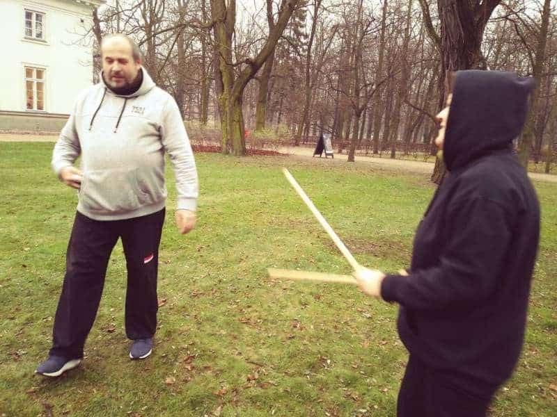 Postanowiłem upiec dwie pieczenie na jednym ogniu. Po pierwsze, wypróbowuje ostatnio na sobie takie monotreningi, po drugie byłem mocno ciekaw, jak to z tą Gatką jest. Ile w niej jest sztuki walki, ile performensu i czy może jeszcze czegoś innego? Przy okazji jeszcze Aśka była zainteresowana, z racji swoich kontaktów z Yogą. Umówiliśmy się więc w sobotni poranek w Łazienkach. Oczywiście zrobiliśmy to zupełnie ad hoc, czyli dość głupio. Absolutnie nie pomyślałem, że przecież nikt nie będzie się spodziewał gości i nie zabezpieczy dla nas odpowiedniego sprzętu. Mam w domu jakieś milicyjne pałki z lat osiemdziesiątych, byłoby w sam raz, a tak leżą, kurzą się czekając na jakiś mecz z Lechem.