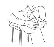 Następnie należy położyć prawą nogę na lewej w taki sposób, żeby prawa stopa opierała się o kolano. Proszę masować górną część lewej pięty przy pomocy palców wskazującego i środkowego od pięty w kierunku punktu bulgoczących studni (patrz rysunek). Ruch powtórzyć 108 razy. Powtórzyć dla drugiej nogi.
