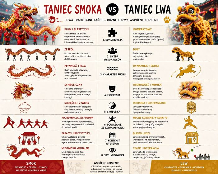 Taniec smoka często jest mylony z tańcem lwa. A różnice są duże. Przede wszystkim lew jest dla pary ludzi (jeden zarządza głową a drugi… nie głową), a smok jest bardziej zespołowy (wielkość grupy jest uzależniona od długości smoka). Lew jest bardziej akrobatyczny, a smok raczej jest performansem. W wielu przypadkach przed smokiem biega jeszcze jeden aktor prezentujący perłę, którą goniący go smok chce połknąć.
