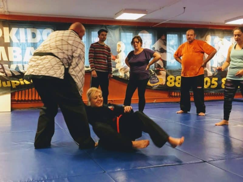 Organizacja treningu — dwie godziny i nie mieliśmy chwili przestoju. Techniki od prostych do bardziej zaawansowanych. Demonstracje krótkie, w przeważającej większości oparte na powalaniu blond asystentki na ziemię. No, dłużna nie zostawała i choć tak na oko o dobre 80 kilo lżejsza od prowadzącego, także kilkukrotnie efektownie cisnęła nim o matę. W rezultacie ćwiczyliśmy więcej, niż patrzyliśmy. Niby powinno to być standardem, ale często dzieje się inaczej.